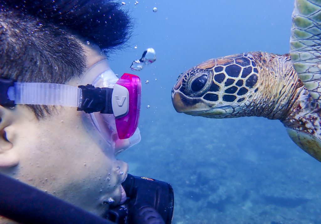 海底世界是令人嚮往的,在教練一對一的帶領下,揹著氣瓶戴著面鏡,體驗內太空自由自在無重力的感受。近距離觀賞色彩繽紛的珊瑚跟魚群,與可愛的海龜共遊,免費水下攝影服務,留下美美的水底紀念照。